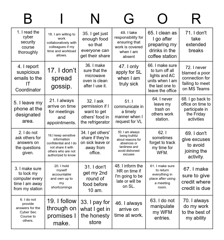 This bingo card has 36 words: 2. I do not ask others for answers on the questions given., 16.I keep sensitive information confidential and I do not share it with others who are not authorized to know, 33. I pay for what I get in the honesty store, 47. I only apply for SL when I am truly sick, 64. I never leave my trash on others work station., 68. I go back to office on time to participate in the Friday activities, 1. I read the cyber security course thoroughly, 19. I follow through on promises I make., 35. I get just enough food so that everyone can get their share, 48. I inform the HR on time if I'm going to be late or will be on SL., 66. I make sure to turn off all lights and AC units when I am the last one to leave the office, 71. I don't take extended breaks, 3. I make sure to lock my computer every time I am away from my station, 21. I always arrive on time for meetings and appointments., 36. I make sure that the microwave oven is clean after I use it., 49. I take responsibility for ensuring that work is covered when I am absent, 61. I make sure to return everything in place after using a meeting room., 69. I don't give excuses to avoid joining the activity., 4. I report suspicious emails to the IT Coordinator, 17. I don’t spread gossip., 34. I get others' share if they're on sick leave or away from office., 50. I am always being truthful about reasons for absences or tardiness and avoid dishonest excuses, 62. I sometimes forget to track my time for WFM., 67. I make sure to give credit where credit is due, 5. I leave my phone at the designated area., 18. I am willing to work collaboratively with colleagues if my time and workload allows., 32. I ask permission if I want to get others' food in the refrigerator, 46. I always arrive on time at work., 65. I clean as I go after preparing my drinks in the coffee station, 72. I never blamed a poor connection for failing to meet on MS Teams, 6. I do not provide answers for the Cyber Sec Course to others., 20. I hold myself accountable and own up to my shortcomings, 31. I don't get my 2nd round of food before 10 am., 51. I communicate in a timely manner when I request for VL, 63. I do not manipulate my WFM entries. and 70. I always do my work to the best of my ability.