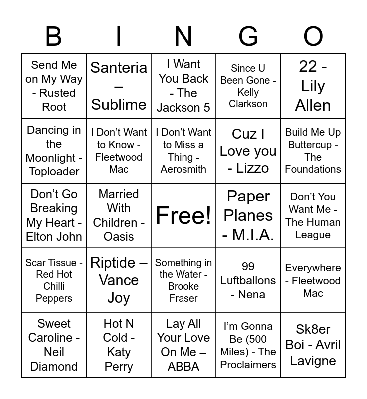 This bingo card has a free space and 35 words: Take on Me - a-Ha, Come On Eileen - Dexys Midnight Runners, Hotel California - The Eagles, I Don’t Want to Know - Fleetwood Mac, Something in the Water - Brooke Fraser, Since U Been Gone - Kelly Clarkson, Dancing in the Moonlight - Toploader, Jessie’s Girl - Rick Springfield, I Don’t Want to Miss a Thing - Aerosmith, 9 to 5 - Dolly Parton, Don’t Go Breaking My Heart - Elton John, 22 - Lily Allen, Don’t Stop Believin’ - Journey, Brazil - Declan McKenna, Send Me on My Way - Rusted Root, Paper Planes - M.I.A., I’m Gonna Be (500 Miles) - The Proclaimers, Married With Children - Oasis, Scar Tissue - Red Hot Chilli Peppers, Sk8er Boi - Avril Lavigne, 99 Luftballons - Nena, Sweet Caroline - Neil Diamond, Everywhere - Fleetwood Mac, Hot N Cold - Katy Perry, I Want You Back - The Jackson 5, Build Me Up Buttercup - The Foundations, Chelsea Dagger - The Fratellis, I Wanna Dance with Somebody - Whitney Houston, Cuz I Love you - Lizzo, Don’t You Want Me - The Human League, Everywhere - Fleetwood Mac, Lay All Your Love On Me – ABBA, Riptide – Vance Joy, Santeria – Sublime and Last Night – The Strokes.