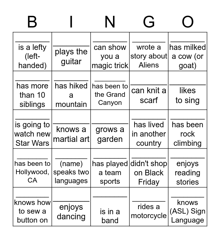 This bingo card has 25 words: ________ (name) speaks two languages, ________ is in a band, ________ has been to the Grand Canyon, ________ knows how to sew a button on, ________ has milked a cow (or goat), ________ is a lefty (left-handed), ________ has more than 10 siblings, ________ plays the guitar, ________ has lived in another country, ________ has played a team sports, ________ can knit a scarf, ________ is going to watch new Star Wars, ________ didn't shop on Black Friday, ________ enjoys reading stories, ________ has hiked a mountain, ________ knows (ASL) Sign Language, ________ has been rock climbing, ________ can show you a magic trick, ________ likes to sing, ________ knows a martial art, ________ grows a garden, ________ enjoys dancing, ________ has been to Hollywood, CA, ________ wrote a story about Aliens and ________ rides a motorcycle.