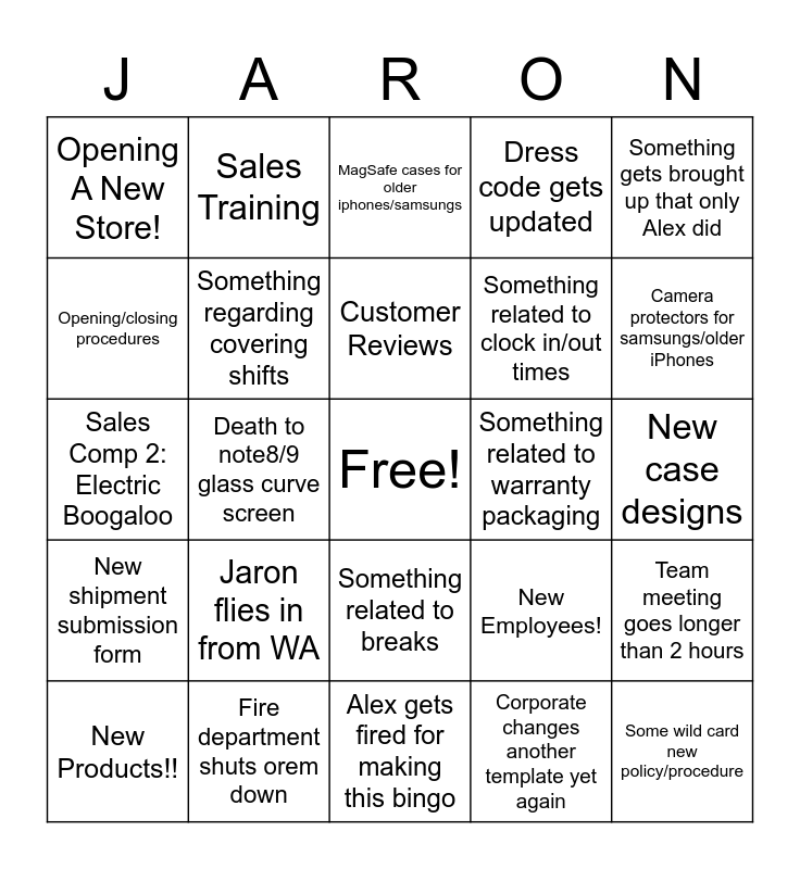 This bingo card has a free space and 24 words: Jaron flies in from WA, Fire department shuts orem down, Customer Reviews, New Products!!, Something gets brought up that only Alex did, Opening A New Store!, Opening/closing procedures, Sales Training, Something related to warranty packaging, Something related to breaks, Something related to clock in/out times, Sales Comp 2: Electric Boogaloo, New Employees!, Team meeting goes longer than 2 hours, Something regarding covering shifts, Corporate changes another template yet again, New case designs, MagSafe cases for older iphones/samsungs, Camera protectors for samsungs/older iPhones, Death to note8/9 glass curve screen, Some wild card new policy/procedure, New shipment submission form, Dress code gets updated and Alex gets fired for making this bingo.