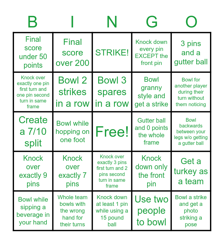 This bingo card has a free space and 24 words: Knock over exactly 7 pins, Whole team bowls with the wrong hand for their turns, Bowl 3 spares in a row, Bowl while sipping a beverage in your hand, 3 pins and a gutter ball, Final score under 50 points, Knock over exactly one pin first turn and one pin second turn in same frame, Final score over 200, Gutter ball and 0 points the whole frame, Knock over exactly 3 pins first turn and 2 pins second turn in same frame, Bowl granny style and get a strike, Create a 7/10 split, Knock down only the front pin, Get a turkey as a team, Bowl 2 strikes in a row, Use two people to bowl, Bowl backwards between your legs w/o getting a gutter ball, STRIKE!, Bowl for another player during their turn without them noticing, Bowl while hopping on one foot, Bowl a strike and get a photo striking a pose, Knock over exactly 9 pins, Knock down every pin EXCEPT the front pin and Knock down at least 1 pin while using a 15 pound ball.