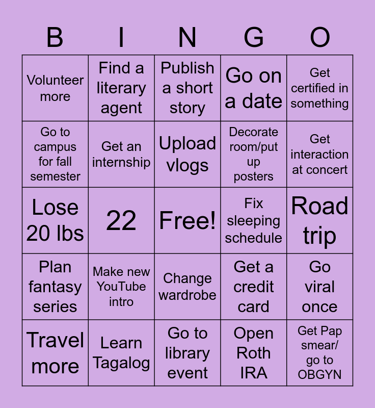 This bingo card has a free space and 35 words: Film short film, Clear skin, Write a song, Get an internship, Change wardrobe, Go on a date, Go to campus for fall semester, Get a promotion/ good job, Upload vlogs, Read 20 books, Lose 20 lbs, Get certified in something, Make recipe book, Finish writing book, Volunteer more, Fix sleeping schedule, Open Roth IRA, 22, Plan fantasy series, Get Pap smear/ go to OBGYN, Get a credit card, Travel more, Go viral once, Learn Tagalog, Publish a short story, Get interaction at concert, Go to convention, Learn basic ASL, Decorate room/put up posters, Road trip, Join a club, Go to library event, Make new YouTube intro, Find a literary agent and Renew passport.