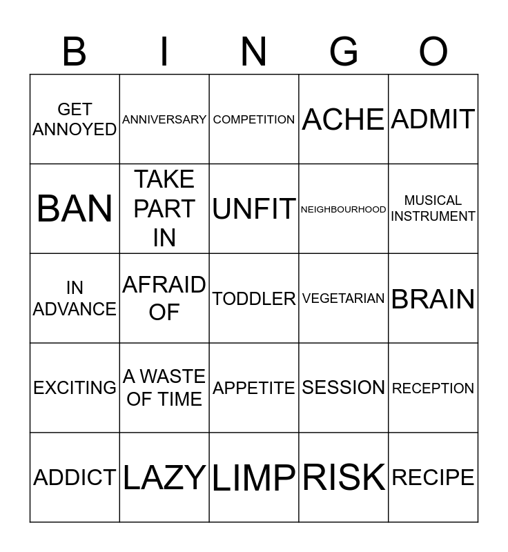 This bingo card has a free space and 24 words: A WASTE OF TIME, LAZY, UNFIT, ADDICT, ADMIT, GET ANNOYED, BAN, ANNIVERSARY, VEGETARIAN, APPETITE, NEIGHBOURHOOD, IN ADVANCE, SESSION, RECEPTION, TAKE PART IN, RISK, BRAIN, COMPETITION, MUSICAL INSTRUMENT, AFRAID OF, RECIPE, EXCITING, ACHE and LIMP.