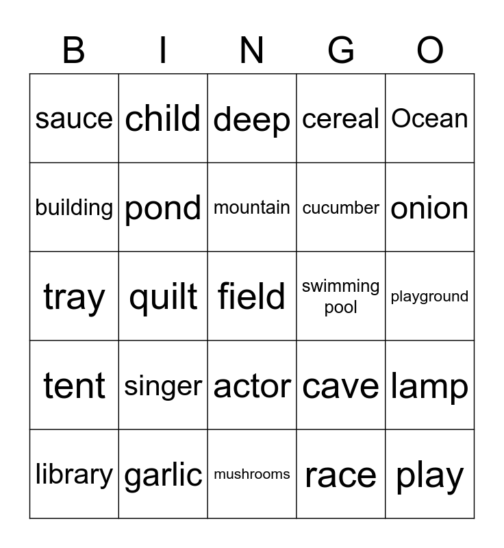 This bingo card has a free space and 24 words: singer, garlic, mountain, library, Ocean, sauce, building, child, swimming pool, actor, cucumber, tray, cave, lamp, pond, race, playground, deep, onion, quilt, play, tent, cereal and mushrooms.
