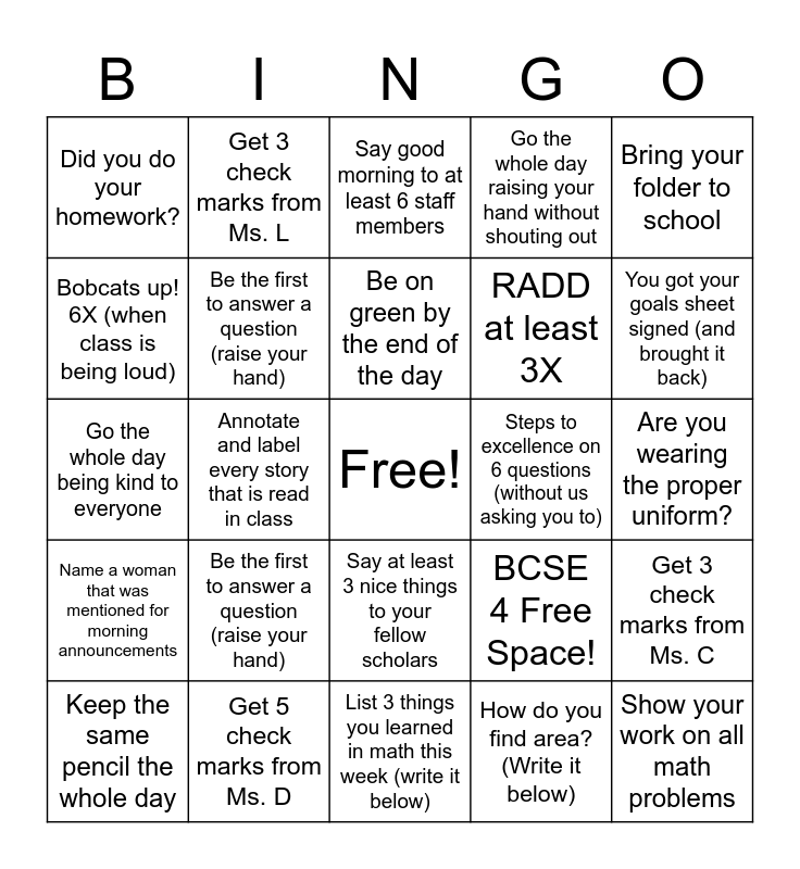 This bingo card has a free space and 24 words: Be the first to answer a question (raise your hand), Get 5 check marks from Ms. D, Be on green by the end of the day, Keep the same pencil the whole day, Bring your folder to school, Did you do your homework?, Bobcats up! 6X (when class is being loud), Get 3 check marks from Ms. L, Steps to excellence on 6 questions (without us asking you to), Say at least 3 nice things to your fellow scholars, RADD at least 3X, Go the whole day being kind to everyone, BCSE 4 Free Space!, Get 3 check marks from Ms. C, Be the first to answer a question (raise your hand), How do you find area? (Write it below), Are you wearing the proper uniform?, Say good morning to at least 6 staff members, You got your goals sheet signed (and brought it back), Annotate and label every story that is read in class, Show your work on all math problems, Name a woman that was mentioned for morning announcements, Go the whole day raising your hand without shouting out and List 3 things you learned in math this week (write it below).