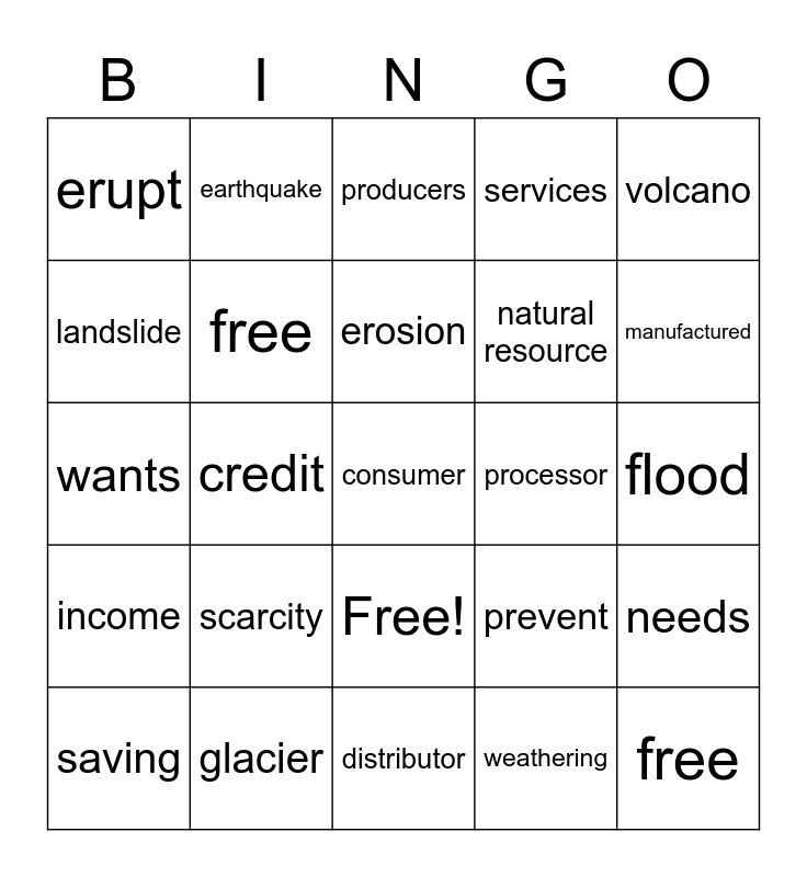 This bingo card has 26 words: Free!, weathering, erosion, glacier, volcano, erupt, landslide, earthquake, flood, prevent, natural resource, wants, needs, saving, credit, goods, services, income, producers, consumer, manufactured, distributor, processor, scarcity, free and free.