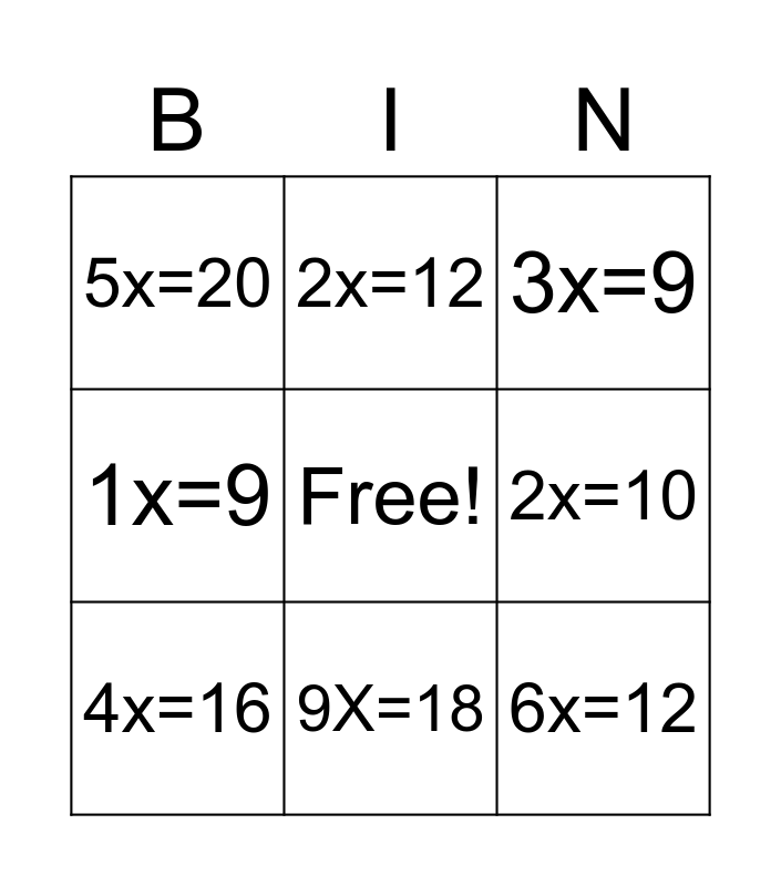 This bingo card has a free space and 8 words: 2x=10, 3x=9, 2x=12, 4x=16, 5x=20, 6x=12, 1x=9 and 9X=18.