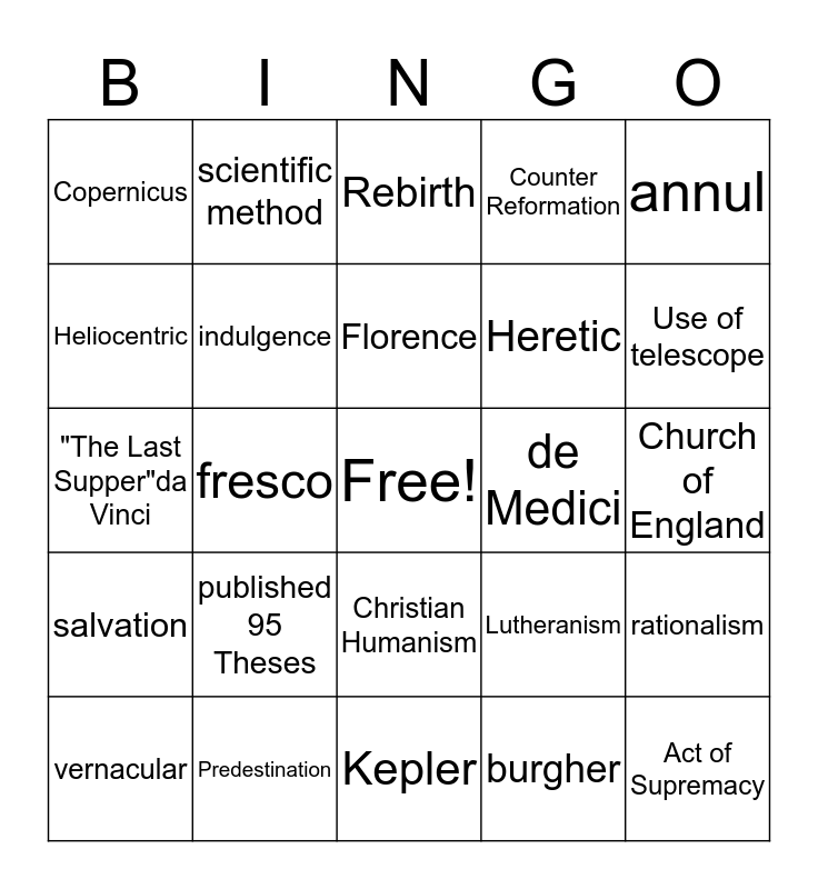 This bingo card has a free space and 32 words: burgher, republic, fresco, humanism, salvation, indulgence, annul, rationalism, scientific method, inductive reasoning, Florence, Rebirth, Classics, Cities, de Medici, perspective, vernacular, "The Last Supper"da Vinci, Christian Humanism, published 95 Theses, Lutheranism, Calvinism, Church of England, Predestination, Act of Supremacy, Counter Reformation, Heretic, Heliocentric, Copernicus, Kepler, Gravity and Use of telescope.