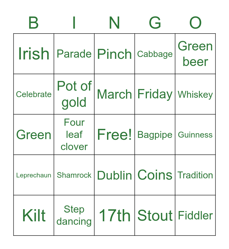 This bingo card has a free space and 41 words: Corned beef, Green, Lucky, Pot of gold, Step dancing, Dublin, March, Potato, Green beer, Leprechaun, Four leaf clover, Cabbage, Fiddler, Guinness, Bagpipe, Shamrock, Ireland, Irish, Holiday, Pinch, Tradition, St Patrick, 17th, Friday, Pub, Emerald, Stout, Rainbow, Whiskey, Alcohol, Harp, Parade, Kilt, Limerick, Coins, Celebrate, Legend, Jig, Charm, Horseshoe and Ale.