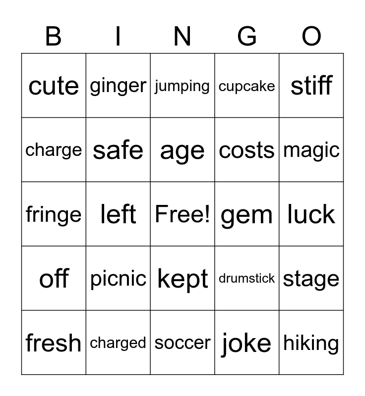 This bingo card has a free space and 33 words: stuff, flag, left, shelf, off, safe, stiff, fresh, ginger, legend, age, jumping, jars, germ, gem, magic, charged, fringe, picnic, drumstick, kept, hiccup, cute, luck, soccer, hiking, cupcake, costs, charge, stage, merge, joke and jacket.