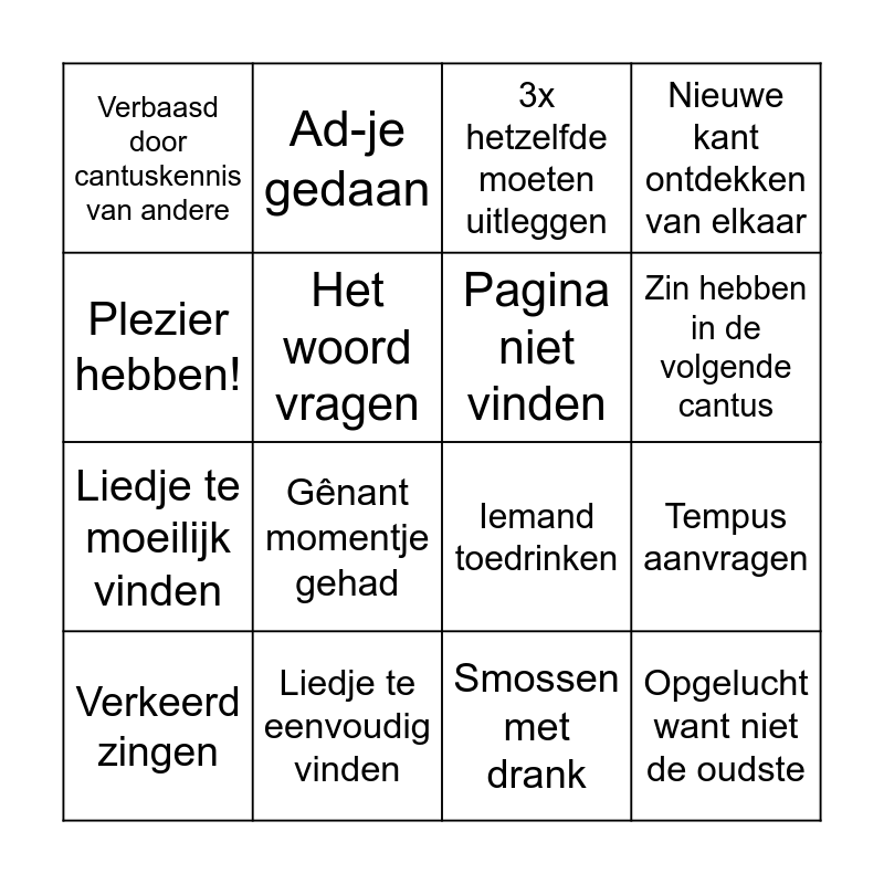 This bingo card has 16 words: Liedje te eenvoudig vinden, Tempus aanvragen, 3x hetzelfde moeten uitleggen, Verbaasd door cantuskennis van andere, Liedje te moeilijk vinden, Ad-je gedaan, Iemand toedrinken, Smossen met drank, Plezier hebben!, Het woord vragen, Verkeerd zingen, Nieuwe kant ontdekken van elkaar, Gênant momentje gehad, Zin hebben in de volgende cantus, Pagina niet vinden and Opgelucht want niet de oudste.
