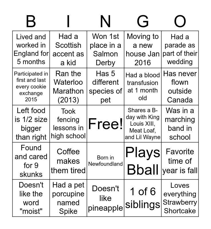 This bingo card has a free space and 24 words: Coffee makes them tired, Had a pet porcupine named Spike, Has 5 different species of pet, Doesn't like the word "moist", Had a parade as part of their wedding, Lived and worked in England for 5 months, Participated in first and last every cookie exchange 2015, Had a Scottish accent as a kid, Shares a B-day with King Louis XIII, Meat Loaf, and Lil Wayne, Born in Newfoundland, Had a blood transfusion at 1 month old, Left food is 1/2 size bigger than right, Plays Bball, Favorite time of year is fall, Ran the Waterloo Marathon (2013), 1 of 6 siblings, Was in a marching band in school, Won 1st place in a Salmon Derby, Has never flown outside Canada, Took fencing lessons in high school, Loves everything Strawberry Shortcake, Found and cared for 9 skunks, Moving to a new house Jan 2016 and Doesn't like pineapple.