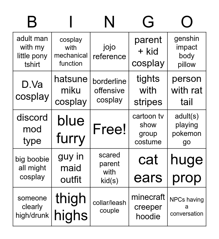 This bingo card has a free space and 24 words: guy in maid outfit, thigh highs, borderline offensive cosplay, someone clearly high/drunk, genshin impact body pillow, adult man with my little pony tshirt, D.Va cosplay, cosplay with mechanical function, cartoon tv show group costume, scared parent with kid(s), tights with stripes, discord mod type, cat ears, huge prop, hatsune miku cosplay, minecraft creeper hoodie, adult(s) playing pokemon go, jojo reference, person with rat tail, blue furry, NPCs having a conversation, big boobie all might cosplay, parent + kid cosplay and collar/leash couple.