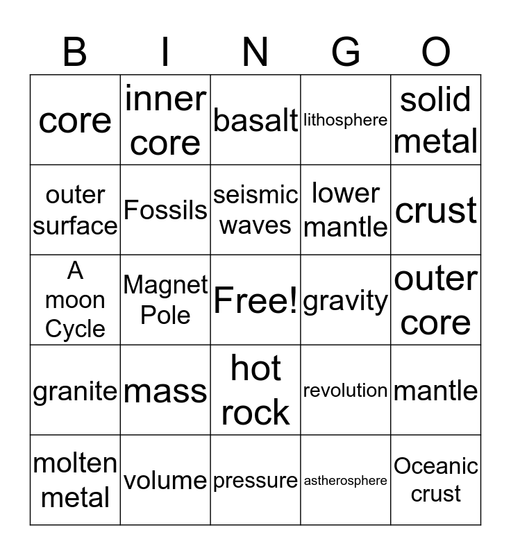 This bingo card has a free space and 24 words: mass, volume, seismic waves, molten metal, solid metal, core, outer surface, inner core, gravity, hot rock, lower mantle, A moon Cycle, revolution, mantle, Fossils, astherosphere, outer core, basalt, crust, Magnet Pole, Oceanic crust, granite, lithosphere and pressure.