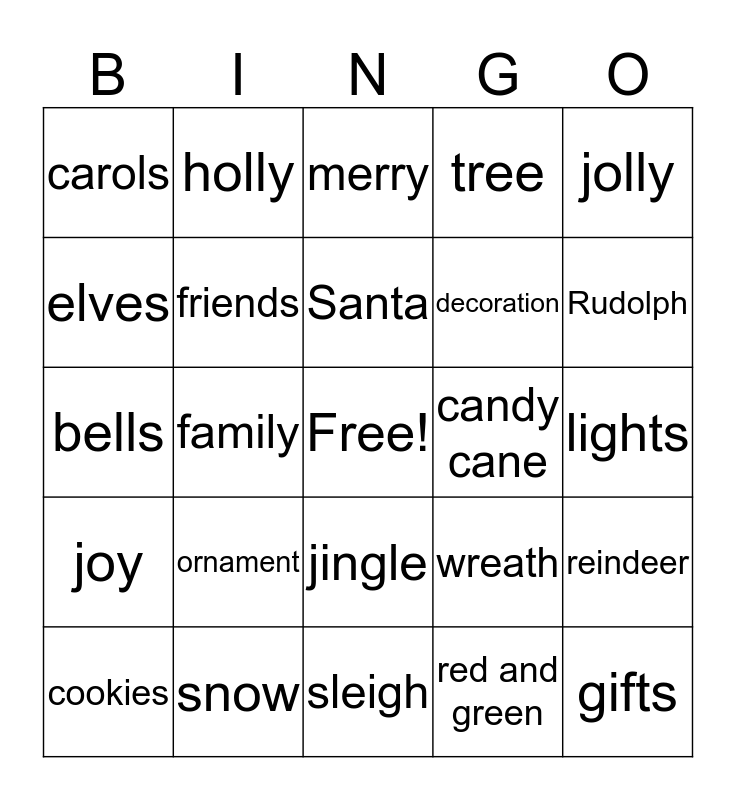 This bingo card has a free space and 27 words: wreath, toys, decoration, sleigh, elves, merry, holly, joy, candy cane, reindeer, bells, tree, cookies, snow, Rudolph, chimney, friends, Santa, ornament, carols, lights, red and green, family, gifts, jingle, jolly and stocking.