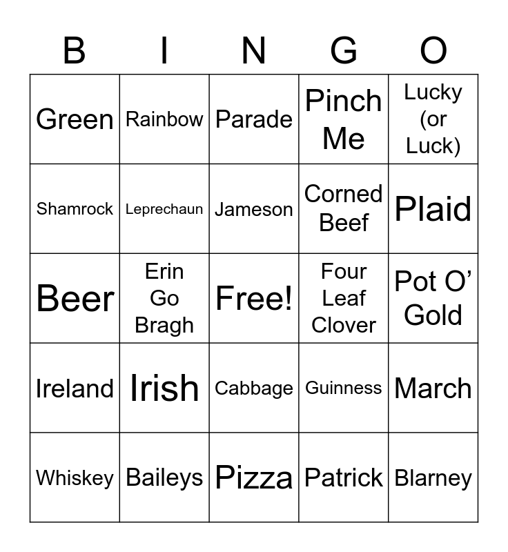 This bingo card has a free space and 24 words: Irish, Baileys, Jameson, Whiskey, Lucky (or Luck), Green, Shamrock, Rainbow, Four Leaf Clover, Cabbage, Corned Beef, Beer, Guinness, March, Leprechaun, Patrick, Pot O’ Gold, Parade, Plaid, Erin Go Bragh, Blarney, Ireland, Pinch Me and Pizza.