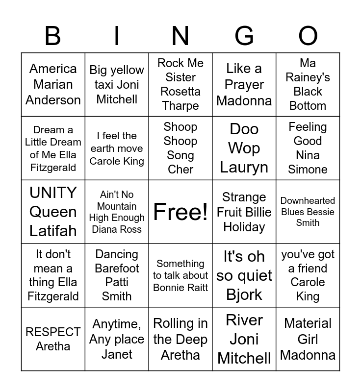 This bingo card has a free space and 37 words: 9 to 5 Dolly Parton, Jolene Dolly Parton, Islands in the Stream Dolly, I feel the earth move Carole King, you've got a friend Carole King, Dancing Barefoot Patti Smith, Shoop Shoop Song Cher, If I could turn back time Cher, Ma Rainey's Black Bottom, I'm coming out Diana Ross, Ain't No Mountain High Enough Diana Ross, Like a Prayer Madonna, Material Girl Madonna, Downhearted Blues Bessie Smith, Dream a Little Dream of Me Ella Fitzgerald, It don't mean a thing Ella Fitzgerald, Didn't it rain Sister Rosetta Tharpe, Rock Me Sister Rosetta Tharpe, Something to talk about Bonnie Raitt, Strange Fruit Billie Holiday, America Marian Anderson, Feeling Good Nina Simone, RESPECT Aretha, Rolling in the Deep Aretha, Forever Young Joan Baez, River Joni Mitchell, Big yellow taxi Joni Mitchell, Proud Mary Tina Turner, Mercedes Janis Joplin, I wanna dance with somebody Whitney, Shoop Salt n Pepa, Anytime, Any place Janet, UNITY Queen Latifah, Bidi Bidi Bom Bom Selena, It's oh so quiet Bjork, Doo Wop Lauryn and 32 Flavors Ani Difranco.