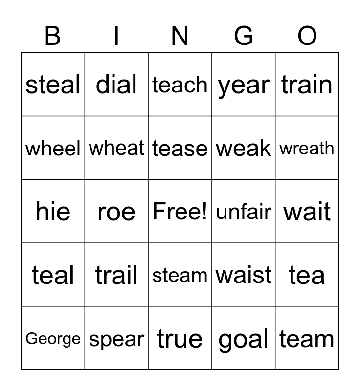 This bingo card has a free space and 24 words: trail, spear, tease, George, train, steal, wheel, dial, unfair, steam, weak, hie, waist, tea, wheat, goal, wait, teach, wreath, roe, team, teal, year and true.