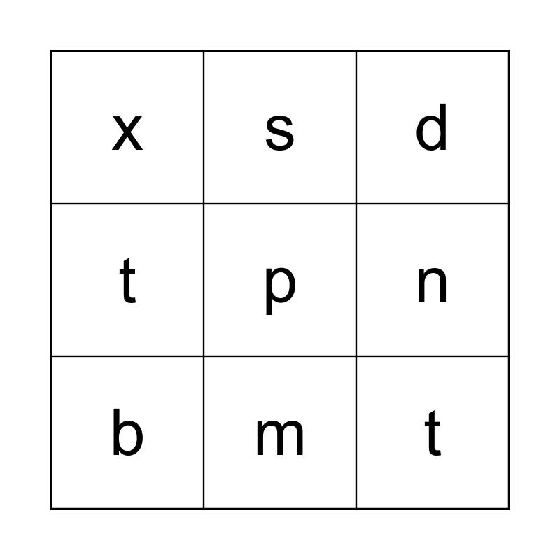 This bingo card has 9 words: b, d, s, t, x, n, p, t and m.