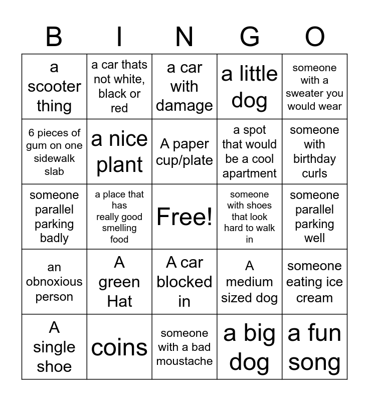 This bingo card has a free space and 24 words: A single shoe, A green Hat, A paper cup/plate, a big dog, someone with a sweater you would wear, a scooter thing, a car thats not white, black or red, a car with damage, someone with shoes that look hard to walk in, someone parallel parking well, someone parallel parking badly, a nice plant, A medium sized dog, someone eating ice cream, 6 pieces of gum on one sidewalk slab, coins, someone with a bad moustache, a little dog, someone with birthday curls, an obnoxious person, a place that has really good smelling food, A car blocked in, a spot that would be a cool apartment and a fun song.