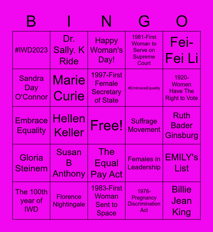 This bingo card has a free space and 29 words: The 100th year of IWD, Equal rights for women, Hellen Keller, Maya Angelou, #IWD2023, Happy Woman's Day!, Marie Curie, Susan B Anthony, Suffrage Movement, Florence Nightingale, Ruth Bader Ginsburg, Billie Jean King, 1983-First Woman Sent to Space, 1978-Pregnancy Discrimination Act, 1920-Women Have The Right to Vote, 1963-Equal Pay Act is Passed, The Equal Pay Act, Gloria Steinem, Fei-Fei Li, Embrace Equality, Females in Leadership, Equality & Empowerment, #EmbraceEquality, Sandra Day O'Connor, 1981-First Woman to Serve on Supreme Court, Dr. Sally. K Ride, EMILY's List, 1997-First Female Secretary of State and Madeleine Albright.