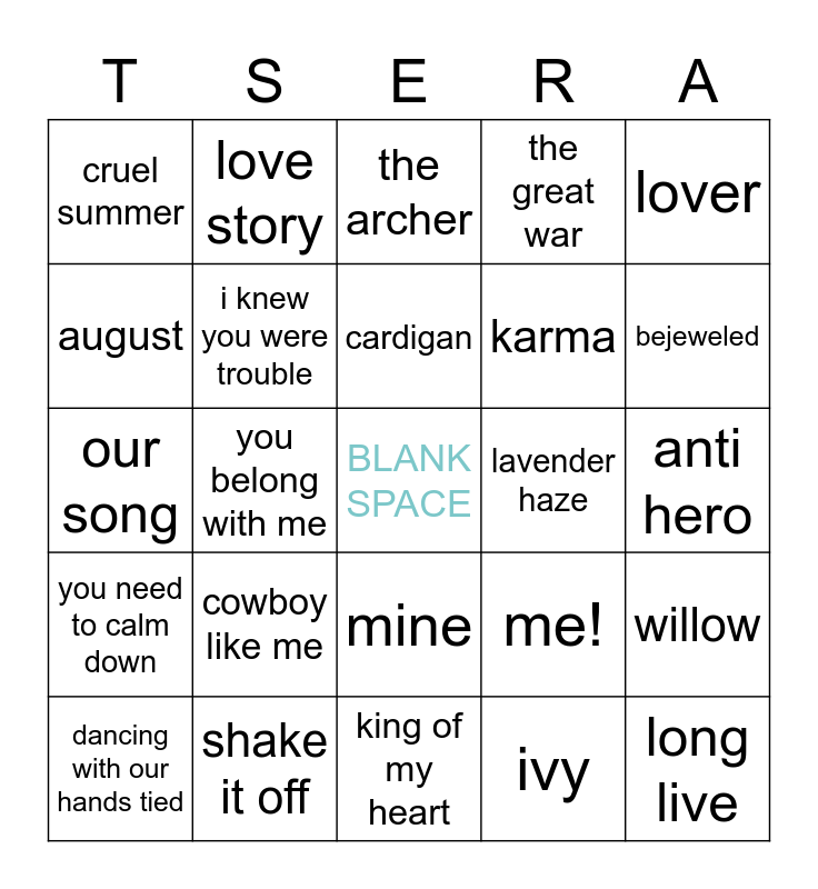 This bingo card has a free space and 24 words: cowboy like me, shake it off, cardigan, dancing with our hands tied, lover, cruel summer, august, love story, lavender haze, mine, karma, our song, me!, willow, i knew you were trouble, ivy, anti hero, the archer, bejeweled, you belong with me, long live, you need to calm down, the great war and king of my heart.