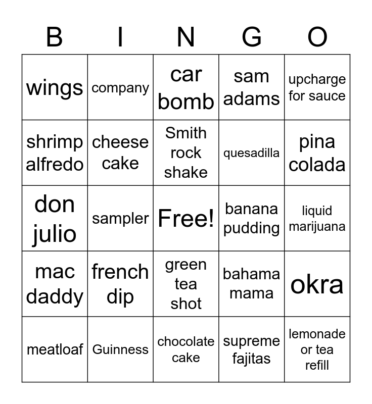 This bingo card has a free space and 28 words: okra, pickles, quesadilla, supreme fajitas, shrimp alfredo, car bomb, company, mac daddy, banana pudding, meatloaf, don julio, sam adams, Guinness, chocolate cake, pina colada, blt, french dip, cheese cake, Smith rock shake, green tea shot, wings, bold rock, lemonade or tea refill, sampler, liquid marijuana, bahama mama, upcharge for sauce and cobb salad.