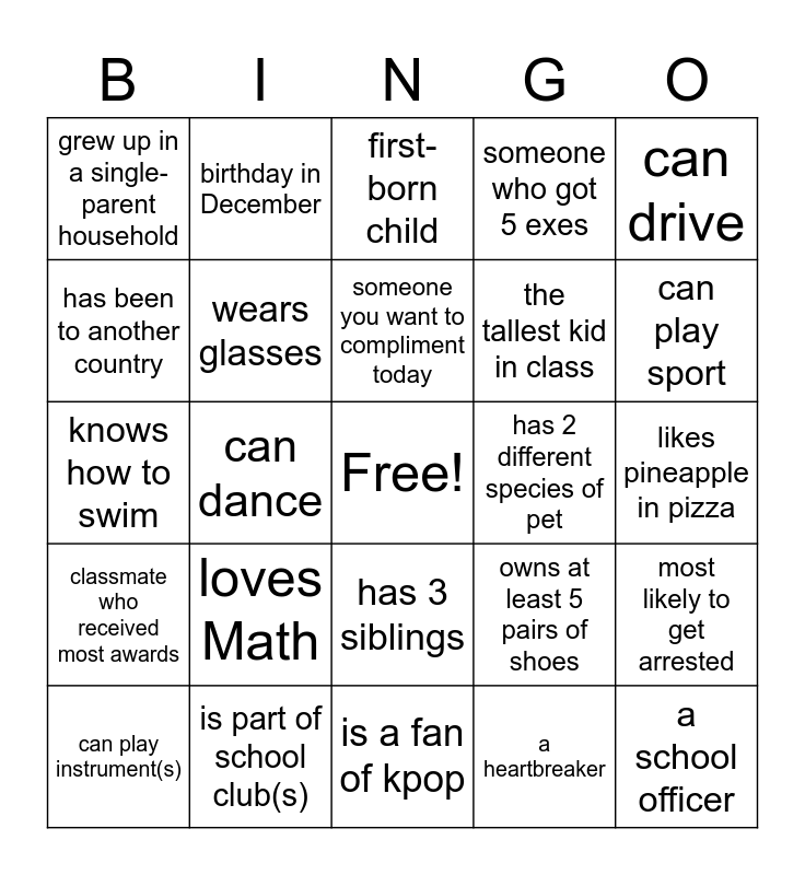 This bingo card has a free space and 24 words: loves Math, is part of school club(s), someone you want to compliment today, can play instrument(s), can drive, grew up in a single-parent household, has been to another country, birthday in December, has 2 different species of pet, has 3 siblings, the tallest kid in class, knows how to swim, owns at least 5 pairs of shoes, most likely to get arrested, wears glasses, a heartbreaker, likes pineapple in pizza, first-born child, can play sport, can dance, a school officer, classmate who received most awards, someone who got 5 exes and is a fan of kpop.