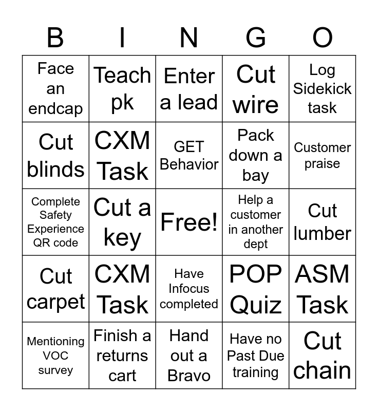 This bingo card has a free space and 38 words: DH Task, DH Task, ASM Task, CXM Task, ASM Task, CXM Task, GET Behavior, POP Quiz, Log Sidekick task, Pack down a bay, Cut a key, Cut wire, Cut chain, Cut lumber, Cut blinds, Cut carpet, Cut pipe, Enter a lead, Load a customer, Help a customer in another dept, Face an endcap, Finish a returns cart, Customer praise, Mentioning VOC survey, Cart run, Hand out a Bravo, Receive a Bravo, Fill an out, Mix paint, Help in another dept, Help in another dept, Have Infocus completed, Have no Past Due training, Teach pk, Learn pk, POP Quiz, Complete Safety Experience QR code and Walk a customer to the product.