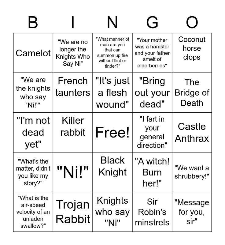This bingo card has a free space and 25 words: "Ni!", Knights who say "Ni", "It's just a flesh wound", "What is the air-speed velocity of an unladen swallow?", Coconut horse clops, Camelot, "We are the knights who say 'Ni!'", "We are no longer the Knights Who Say Ni", "I fart in your general direction", Black Knight, "Bring out your dead", "I'm not dead yet", "A witch! Burn her!", "We want a shrubbery!", French taunters, Holy Grail, Castle Anthrax, "What manner of man are you that can summon up fire without flint or tinder?", The Bridge of Death, Killer rabbit, "Message for you, sir", Trojan Rabbit, "What's the matter, didn't you like my story?", "Your mother was a hamster and your father smelt of elderberries" and Sir Robin's minstrels.