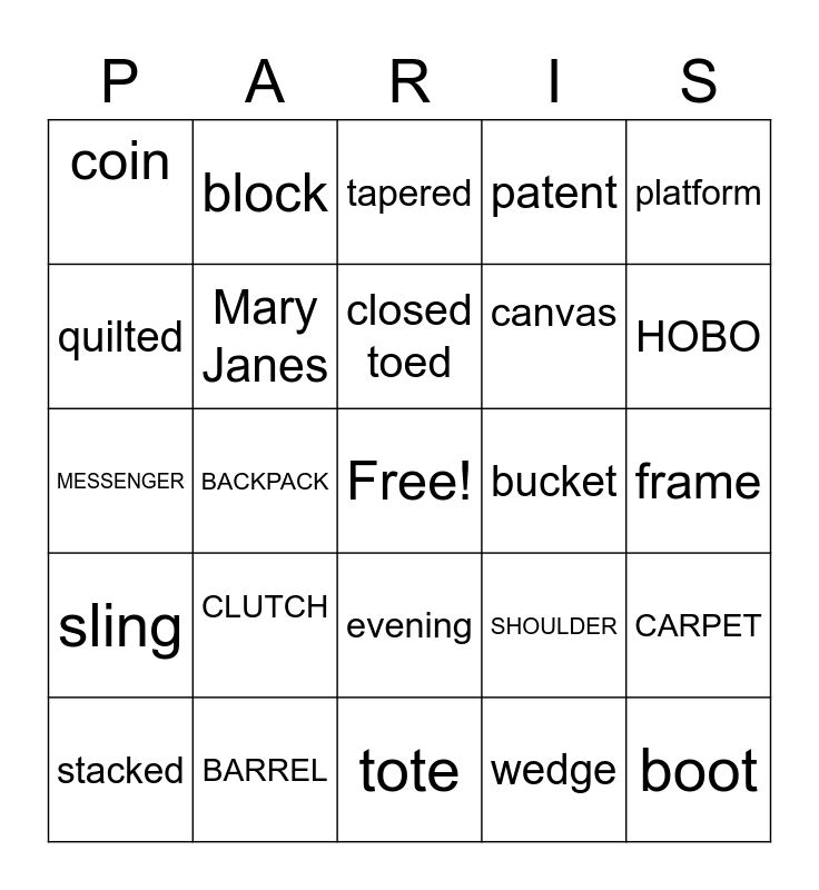 This bingo card has a free space and 34 words: stilettos, wedge, kitten, strappy, sling, Mary Janes, platform, stacked, block, open toed, closed toed, tapered, pump, sandal, bucket, HOBO, BARREL, MESSENGER, CLUTCH, SHOULDER, evening, wristlet, coin, frame, tote, boot, patent, leather, canvas, quilted, snakeskin, BACKPACK, CARPET and CROSSBODY.