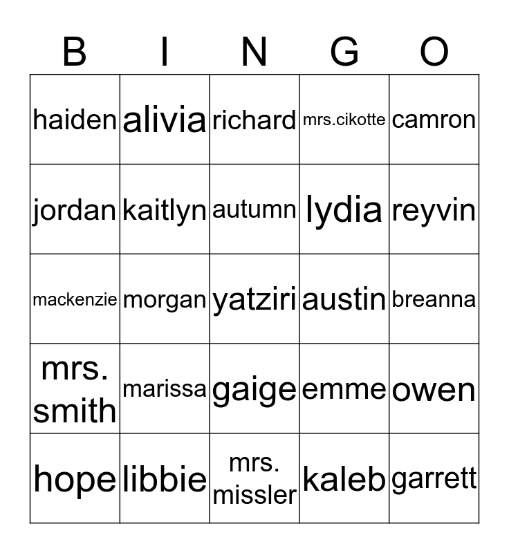 This bingo card has a free space and 24 words: marissa, libbie, autumn, hope, camron, haiden, jordan, alivia, austin, gaige, lydia, mackenzie, emme, owen, kaitlyn, kaleb, breanna, richard, reyvin, morgan, garrett, mrs. smith, mrs.cikotte and mrs. missler.