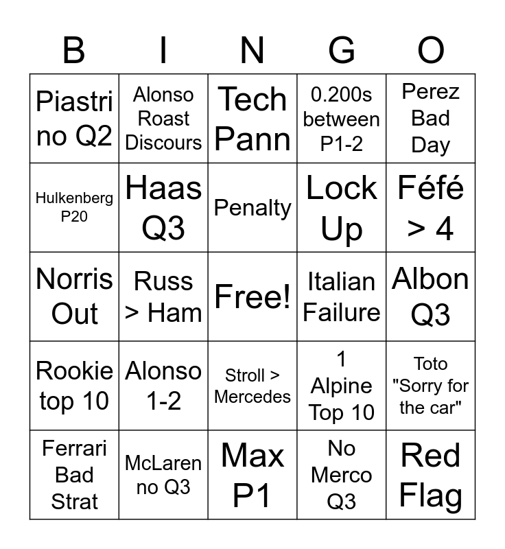 This bingo card has a free space and 29 words: Ferrari Bad Strat, Ham Whining, Russ > Ham, Tsu > De Vries, Piastri no Q2, Tech Pann, Haas Q3, Alonso 1-2, Italian Failure, McLaren no Q3, Albon Q3, Red Flag, Max P1, No Merco Q3, Féfé > 4, Teamplay Strat, Stroll > Mercedes, Rookie top 10, Perez Bad Day, Norris Out, 1 Alpine Top 10, Track Limit, Lock Up, Hulkenberg P20, 0.200s between P1-2, Alonso Roast Discours, Toto "Sorry for the car", Penalty and Traffic.