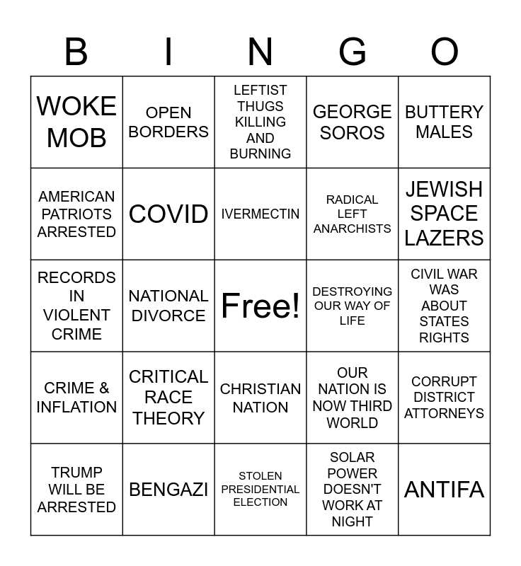 This bingo card has a free space and 27 words: OUR NATION IS NOW THIRD WORLD, AMERICAN DREAM IS DEAD, RADICAL LEFT ANARCHISTS, STOLEN PRESIDENTIAL ELECTION, AMERICAN PATRIOTS ARRESTED, LEFTIST THUGS KILLING AND BURNING, OPEN BORDERS, CRIME & INFLATION, DESTROYING OUR WAY OF LIFE, CORRUPT DISTRICT ATTORNEYS, RECORDS IN VIOLENT CRIME, GEORGE SOROS, TRUMP WILL BE ARRESTED, BENGAZI, JEWISH SPACE LAZERS, CHINA, COVID, IVERMECTIN, CRITICAL RACE THEORY, WOKE MOB, CIVIL WAR WAS ABOUT STATES RIGHTS, SOLAR POWER DOESN'T WORK AT NIGHT, NATIONAL DIVORCE, ANTIFA, CHRISTIAN NATION, BUTTERY MALES and ♡ PUTIN ♡.