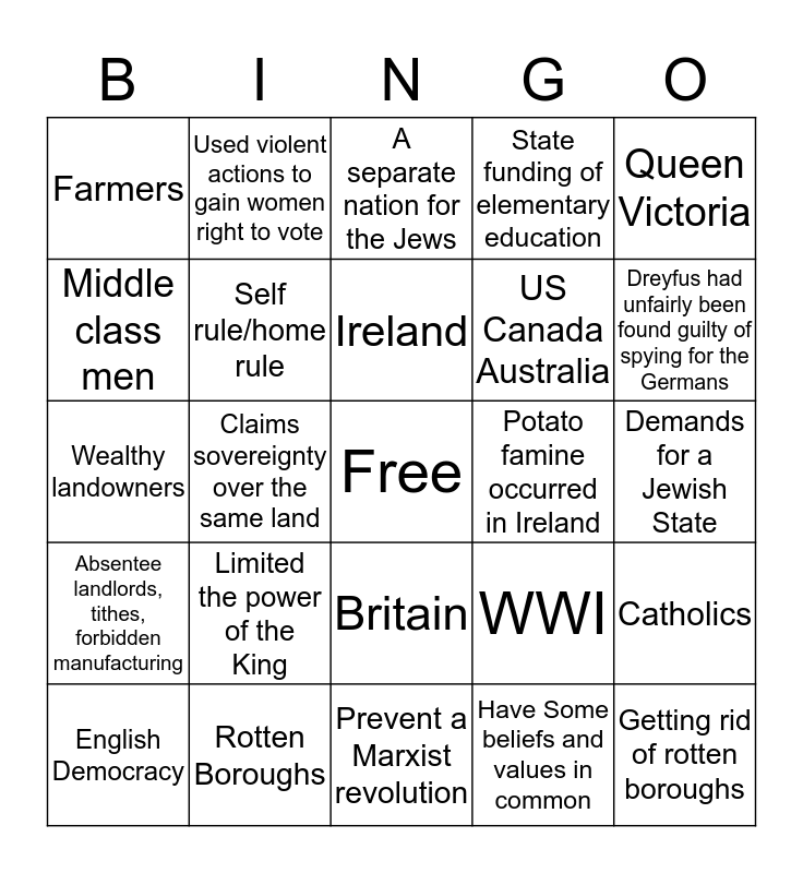 This bingo card has a free space and 24 words: Limited the power of the King, Rotten Boroughs, Ireland, English Democracy, Queen Victoria, Farmers, Middle class men, Used violent actions to gain women right to vote, Potato famine occurred in Ireland, Britain, US Canada Australia, Wealthy landowners, WWI, Catholics, Self rule/home rule, Have Some beliefs and values in common, Demands for a Jewish State, A separate nation for the Jews, Dreyfus had unfairly been found guilty of spying for the Germans, Claims sovereignty over the same land, Getting rid of rotten boroughs, Absentee landlords, tithes, forbidden manufacturing, State funding of elementary education and Prevent a Marxist revolution.