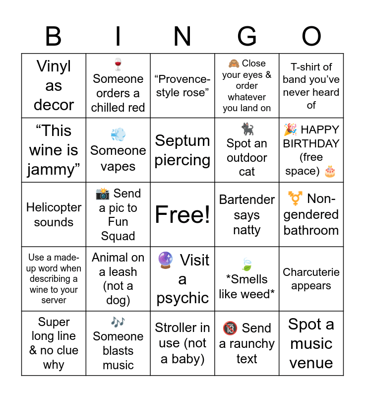 This bingo card has a free space and 25 words: Animal on a leash (not a dog), Stroller in use (not a baby), Septum piercing, Super long line & no clue why, T-shirt of band you’ve never heard of, Vinyl as decor, “This wine is jammy”, 🍷 Someone orders a chilled red, Bartender says natty, 🔮 Visit a psychic, 🐈⬛ Spot an outdoor cat, Helicopter sounds, 🍃 *Smells like weed*, Charcuterie appears, 💨 Someone vapes, Dual sleeve tattoos, ⚧️ Non-gendered bathroom, “Provence-style rose”, 🎉 HAPPY BIRTHDAY (free space) 🎂, 📸 Send a pic to Fun Squad, Spot a music venue, 🎶 Someone blasts music, Use a made-up word when describing a wine to your server, 🙈 Close your eyes & order whatever you land on and 🔞 Send a raunchy text.
