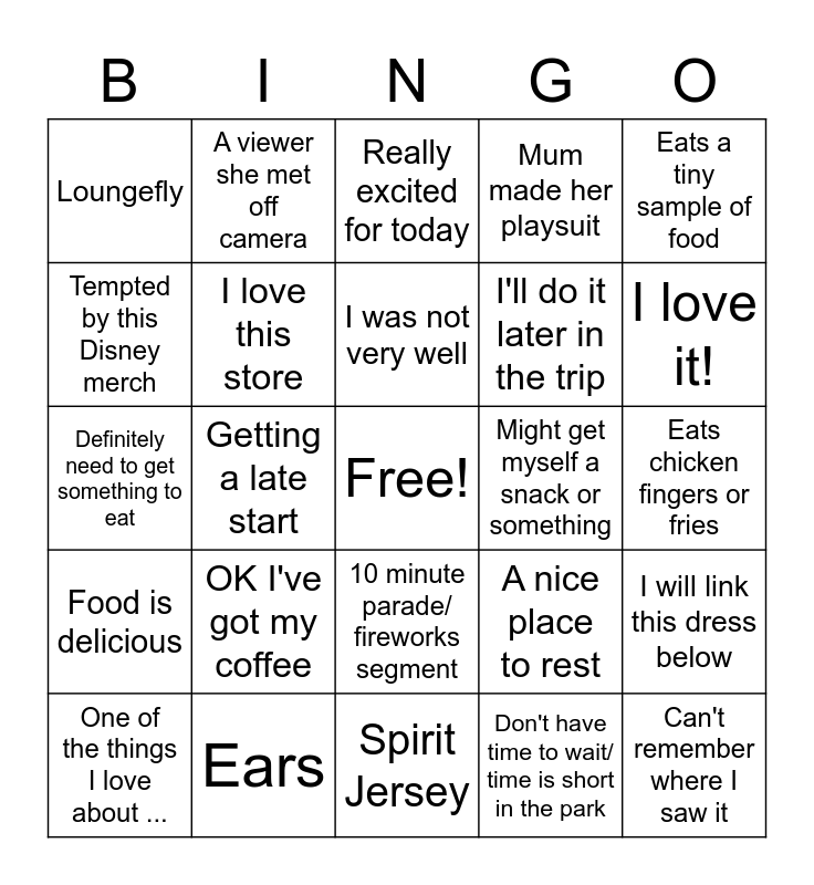 This bingo card has a free space and 24 words: OK I've got my coffee, Ears, I was not very well, One of the things I love about ..., Eats a tiny sample of food, Loungefly, Tempted by this Disney merch, A viewer she met off camera, Might get myself a snack or something, 10 minute parade/ fireworks segment, I'll do it later in the trip, Definitely need to get something to eat, A nice place to rest, I will link this dress below, I love this store, Don't have time to wait/ time is short in the park, Eats chicken fingers or fries, Really excited for today, I love it!, Getting a late start, Can't remember where I saw it, Food is delicious, Mum made her playsuit and Spirit Jersey.