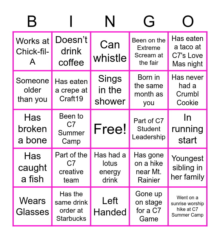 This bingo card has a free space and 24 words: Part of the C7 creative team, Has the same drink order at Starbucks, Sings in the shower, Wears Glasses, Has eaten a taco at C7's Love Mas night, Works at Chick-fil-A, Someone older than you, Doesn’t drink coffee, Part of C7 Student Leadership, Has had a lotus energy drink, Born in the same month as you, Has broken a bone, Has gone on a hike near Mt. Rainier, Youngest sibling in her family, Has eaten a crepe at Craft19, Gone up on stage for a C7 Game, In running start, Can whistle, Has never had a Crumbl Cookie, Been to C7 Summer Camp, Went on a sunrise worship hike at C7 Summer Camp, Has caught a fish, Been on the Extreme Scream at the fair and Left Handed.
