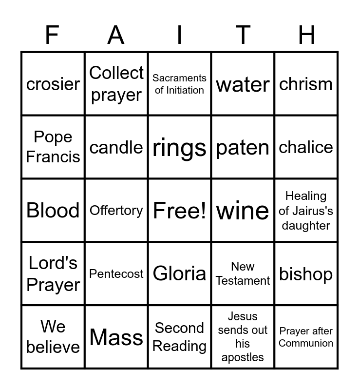 This bingo card has a free space and 79 words: Sacraments, Seven, Sacraments of Initiation, Sacraments of Service, Sacraments of Healing, Baptism, Eucharist, Confirmation, Matrimony, Holy Orders, Anointing of the Sick, Reconciliation, water, chrism, white garment, candle, bread, wine, Body, Blood, laying on of hands, rings, paten, chalice, crosier, miter, chasuble, stole, Baptism by John, The Last Supper, Pentecost, Wedding at Cana, Jesus sends out his apostles, Healing of Jairus's daughter, Forgiveness of the paralyzed man, Mass, deacon, priest, bishop, Pope Francis, Bishop Gruss, Father Rob, Introductory Rites, Gathering song, Processional, Collect prayer, Gloria, Liturgy of the Word, First Reading, Old Testament, Psalm Response, Second Reading, New Testament, Alleluia, Gospel reading, Homily, Creed, Prayer of the Faithful, Lord, hear our prayer, We believe, Offertory, Eucharistic Prayer, Liturgy of the Eucharist, Holy Holy Holy, Memorial Acclamation, Great Amen, Consecration, Lamb of God, Sign of Peace, Lord's Prayer, Communion, Body of Christ, Blood of Christ, Prayer after Communion, Final blessing, Go in peace, Concluding Rites, Recessional hymn and Jesus.