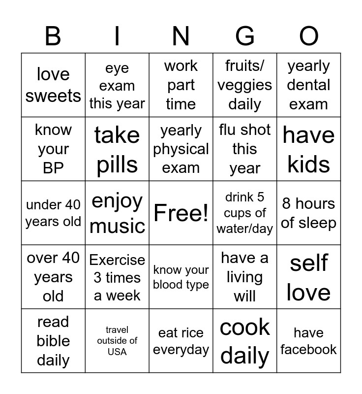 This bingo card has a free space and 24 words: Exercise 3 times a week, travel outside of USA, yearly physical exam, read bible daily, yearly dental exam, love sweets, know your BP, eye exam this year, drink 5 cups of water/day, know your blood type, flu shot this year, under 40 years old, have a living will, self love, take pills, cook daily, 8 hours of sleep, work part time, have kids, enjoy music, have facebook, over 40 years old, fruits/ veggies daily and eat rice everyday.