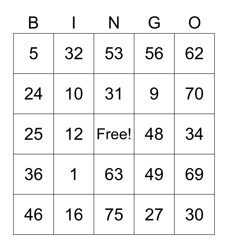 This bingo card has a free space and 24 words: 1, 16, 31, 46, 62, 5, 24, 32, 48, 63, 9, 25, 49, 69, 10, 27, 34, 53, 70, 12, 30, 36, 56 and 75.