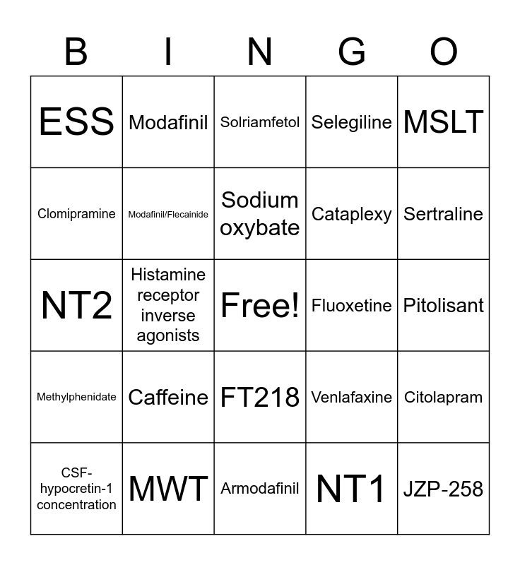 This bingo card has a free space and 24 words: Caffeine, MWT, Sodium oxybate, CSF-hypocretin-1 concentration, MSLT, ESS, Clomipramine, Modafinil, Fluoxetine, FT218, Cataplexy, NT2, Venlafaxine, Citolapram, Modafinil/Flecainide, NT1, Pitolisant, Solriamfetol, Sertraline, Histamine receptor inverse agonists, JZP‑258, Methylphenidate, Selegiline and Armodafinil.