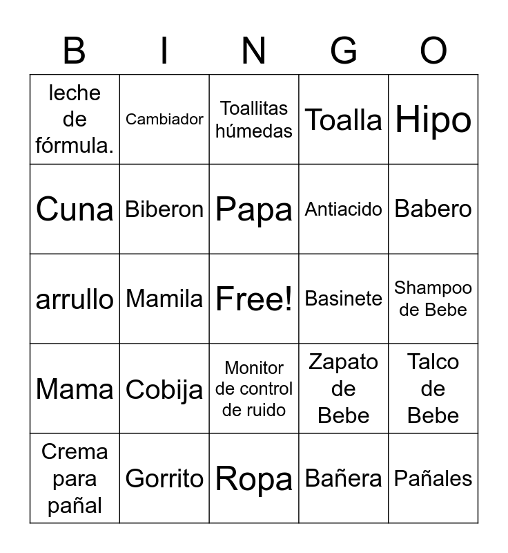 This bingo card has a free space and 36 words: Bebe, Carriola, Chupete, Biberon, Zapato de Bebe, Mama, Papa, Hermanos, Hipo, popo, Mamila, Toalla, Asiento de carro, Basinete, Babero, leche de fórmula., Panalera, Cobija, Pañales, Toallitas húmedas, Shampoo de Bebe, Talco de Bebe, Gorrito, Crema para pañal, Ropa, Cambiador, arrullo, Embarazo, Antiacido, Cuna, Colchón de base., Extractores de leche materna, Bañera, Monitor de control de ruido, Termómetro and Juguetes.