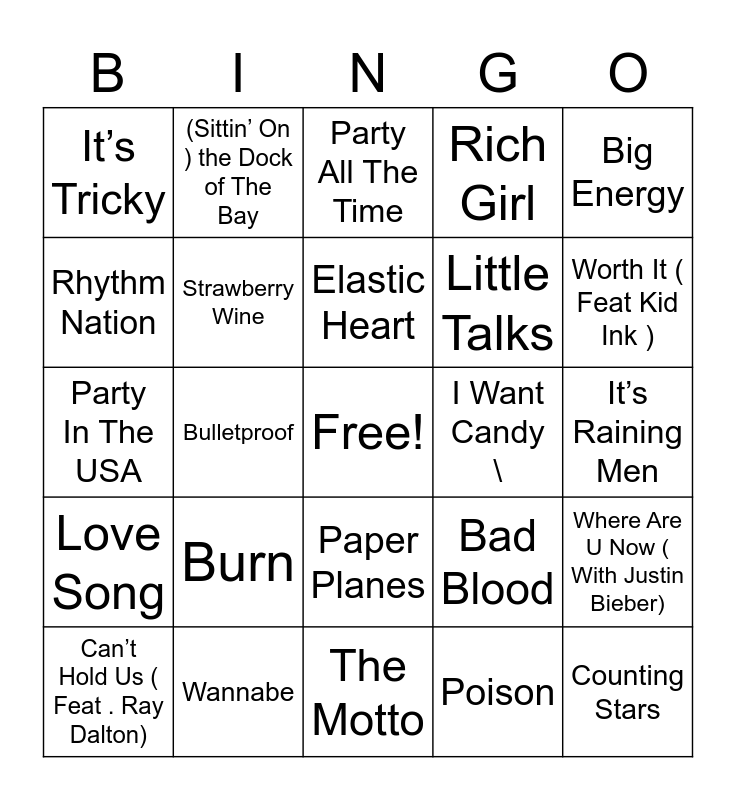 This bingo card has a free space and 70 words: Every Rose Has Its Thorns, It’s Raining Men, Hey Mama, Imma Be, Wannabe, GIRL LIKE ME, Rich Girl, Beverly Hills, Big Energy, BREAK MY SOUL, Where Are U Now ( With Justin Bieber), Stacy’s Mom, It’s Tricky, Party All The Time, Macarena, Bulletproof, Paper Planes, Little Talks, Boom Clap, Love Song, I Want Candy \, Bad Blood, Worth It ( Feat Kid Ink ), Push It, Seventh Nation Army, Empire State Of Mind, If I Can’t Have You, Raspberry Beret, Poison, Youngblood, (Sittin’ On ) the Dock of The Bay, Dog Days Are Over, P.Y.T ( Pretty Young Thing), Pennies From Heaven, Everybody Wants To Rule The World, The Git Up, Say You Love Me, Long Tall Sally ( The Thing), Senorita, Rhythm Nation, None Of Your Business, Burn, Counting Stars, Fine By Me, Just Like Fire, Strawberry Wine, Can’t Hold Us ( Feat . Ray Dalton), Doo Wop ( That Thing), Never Going Back Again, Nothin’ on You ( feat. Bruno Mars), Beauty And A Beat, Ms.Jackson, FourFiveSeconds, Enemy ( with JID), The Motto, Mother, Elastic Heart, Whip It, The Jean Genie, I Heard It Through The Grapevine, Party In The USA, Killer Queen, Eye Of The Tiger, Jet Airliner, Shout, Island In The Stream, Joy To The World, Nutbush City Limits, Superstition and Santeria.