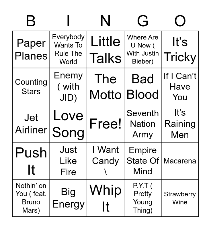 This bingo card has a free space and 69 words: Every Rose Has Its Thorns, It’s Raining Men, Hey Mama, Beverly Hills, Big Energy, BREAK MY SOUL, Where Are U Now ( With Justin Bieber), Stacy’s Mom, It’s Tricky, Party All The Time, Macarena, Bulletproof, Paper Planes, Little Talks, Boom Clap, Love Song, I Want Candy \, Bad Blood, Worth It ( Feat Kid Ink ), Push It, Seventh Nation Army, Empire State Of Mind, If I Can’t Have You, Raspberry Beret, Poison, Youngblood, (Sittin’ On ) the Dock of The Bay, Dog Days Are Over, P.Y.T ( Pretty Young Thing), Pennies From Heaven, Everybody Wants To Rule The World, The Git Up, Say You Love Me, Long Tall Sally ( The Thing), Senorita, Rhythm Nation, None Of Your Business, Burn, Counting Stars, Fine By Me, Just Like Fire, Strawberry Wine, Can’t Hold Us ( Feat . Ray Dalton), Doo Wop ( That Thing), Never Going Back Again, Nothin’ on You ( feat. Bruno Mars), Beauty And A Beat, Ms.Jackson, FourFiveSeconds, Enemy ( with JID), The Motto, Mother, Elastic Heart, Whip It, The Jean Genie, I Heard It Through The Grapevine, Party In The USA, Killer Queen, Eye Of The Tiger, Jet Airliner, Shout, Island In The Stream, Joy To The World, Walk Like An Egyptian, Just Can’t Get Enough, La Bamba, Nutbush City Limits, Superstition and Santeria.
