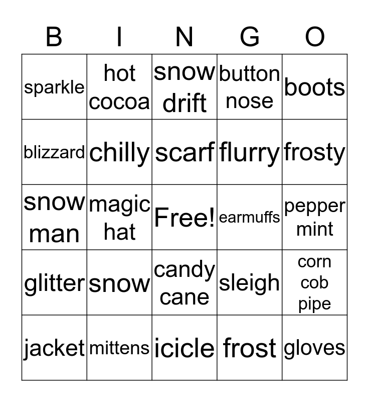 This bingo card has a free space and 24 words: snow, mittens, scarf, jacket, boots, sparkle, blizzard, hot cocoa, earmuffs, candy cane, flurry, snow man, sleigh, corn cob pipe, chilly, frost, pepper mint, snow drift, frosty, magic hat, gloves, glitter, button nose and icicle.