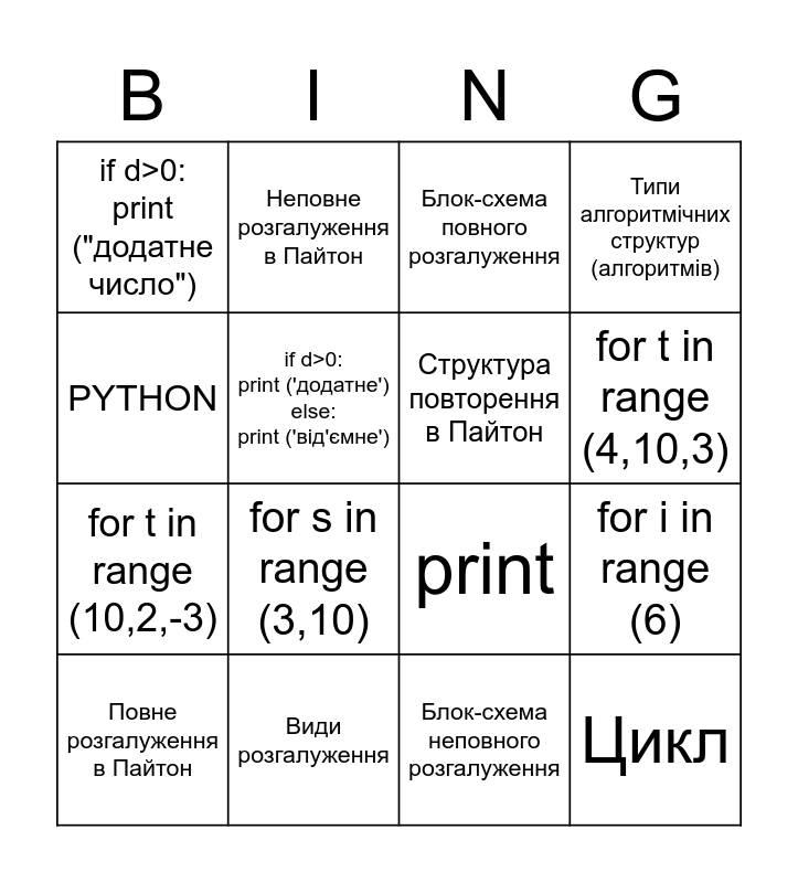 This bingo card has 16 words: Види розгалуження, for i in range (6), Блок-схема повного розгалуження, if d>0: print ("додатне число"), for t in range (10,2,-3), Неповне розгалуження в Пайтон, print, Блок-схема неповного розгалуження, PYTHON, if d>0: print ('додатне') else: print ('від'ємне'), Повне розгалуження в Пайтон, Типи алгоритмічних структур (алгоритмів), for s in range (3,10), for t in range (4,10,3), Структура повторення в Пайтон and Цикл.
