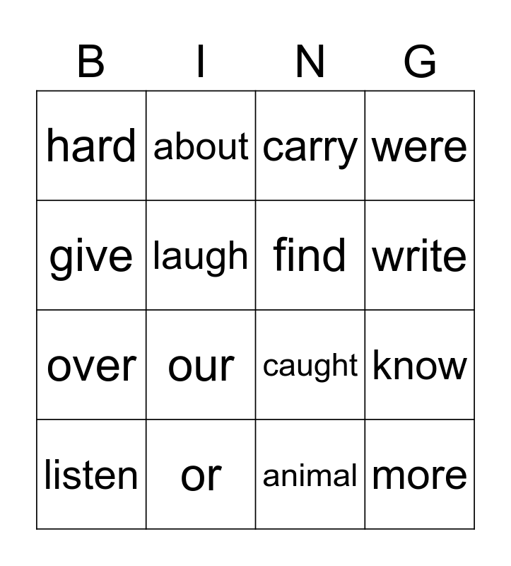 This bingo card has 24 words: start, found, write, other, give, hard, laugh, about, or, food, over, caught, woman, would, find, because, animal, carry, our, know, listen, more, were and and.