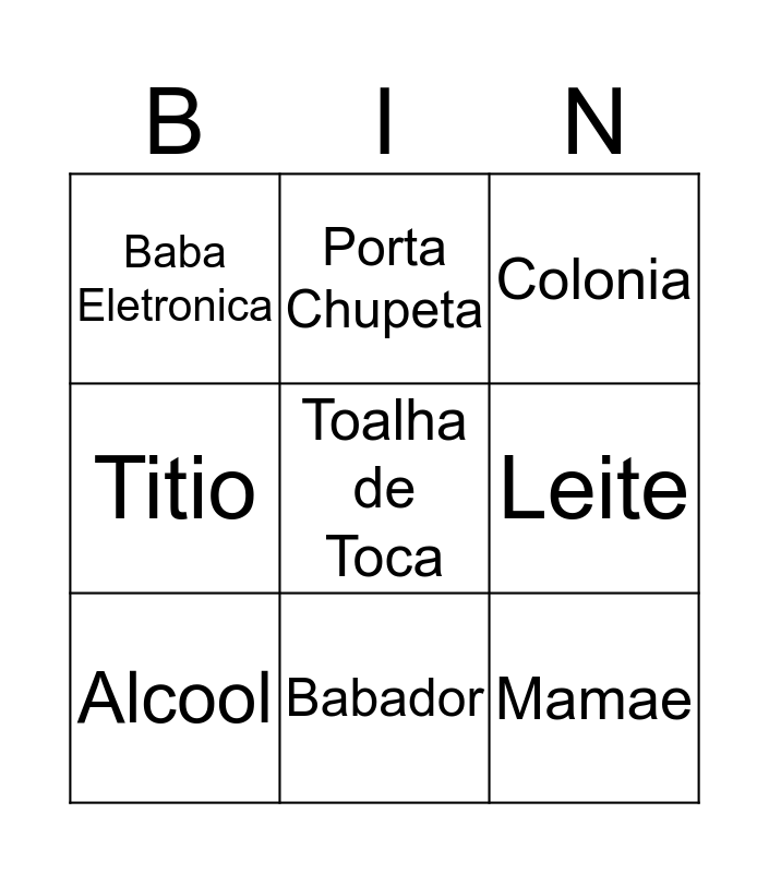 This bingo card has 67 words: Chupeta, Mamadeira, Body, Bebe, Banho, Berco, Porta Chupeta, Engatinhar, Babador, Papinha, Colher, Manta, Locao, Toalha de Toca, Gorrinho, Leite, Aspirador Nasal, Baba Eletronica, Mala, Mamae, Papai, Titia, Titio, Protetor Solar, Bebe Conforto, Fralda, Toalhas Umidas, Shampoo, Cadeirinha, Cotonete, Amamentacao, Protetor Tomada, Sapatinho, Trocador de Fralda, Banheira, Edredon, Macacao, Kit Higiene, Escova, Sabonete, Algodao, Alcool, Album de Fotos, Amigos, Bolsa Termica, Brinquedo, Cabide, Poltrona, Cancao de Ninar, Chocalho, Colonia, Crème Hidratante, Esponja de Banho, Esterilizador, Familia, Felicidade, Vovó, Boneco, Gestacao, Madrinha, Mordedor, Nascimento, Presentes, Termometro, Ultrassom, Umidificador and Ursinho.