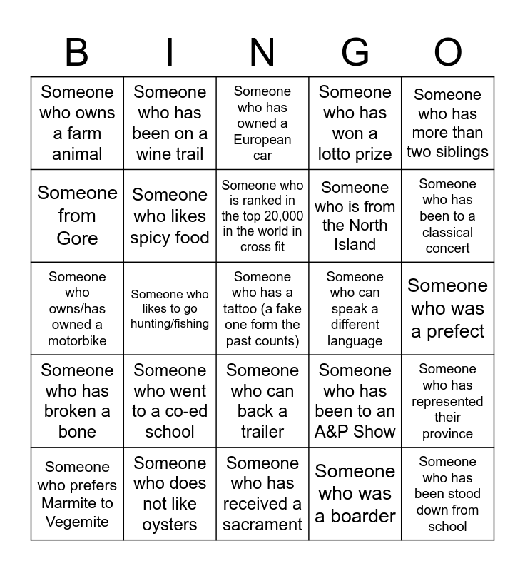 This bingo card has a free space and 24 words: Someone who went to a co-ed school, Someone who does not like oysters, Someone who is ranked in the top 20,000 in the world in cross fit, Someone who prefers Marmite to Vegemite, Someone who has more than two siblings, Someone who owns a farm animal, Someone from Gore, Someone who has been on a wine trail, Someone who can speak a different language, Someone who can back a trailer, Someone who is from the North Island, Someone who owns/has owned a motorbike, Someone who has been to an A&P Show, Someone who has represented their province, Someone who likes spicy food, Someone who was a boarder, Someone who was a prefect, Someone who has owned a European car, Someone who has been to a classical concert, Someone who likes to go hunting/fishing, Someone who has been stood down from school, Someone who has broken a bone, Someone who has won a lotto prize and Someone who has received a sacrament.